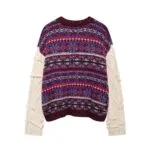 Discover this Jacquard Knitis a true fashion gem. The intricate jacquard pattern adds a touch of elegance and sophistication. The round neck provides a classic look that’s both timeless and versatile. What makes it truly unique are the frayed trims, which give it an edgy and distressed charm.