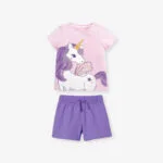 Girls Unicorn Cartoon Summer Set – Kids Knit T-Shirt & Shorts Outfit