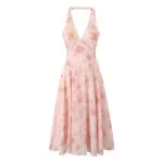 Step into our Rose Print Halter Sundress. Each delicate rose adds sophistication. The fitted waist flatters and accentuates your curves, creating an hourglass figure. The voluminous, wide – cut skirt flows gracefully, giving you a regal presence.